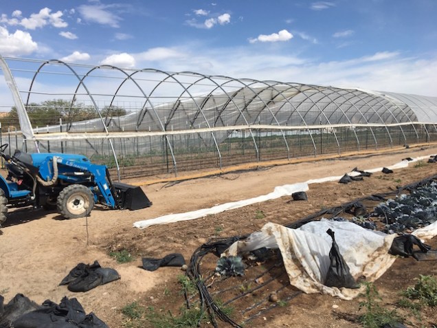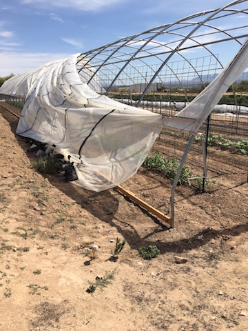 Yesterday a very strong dust devil ripped off and shredded a portion of the high-tunnel cover. We will remove the remainder of the cover and attach shade cloth for the summer months. In the fall when it cools off we will put on a new cover.